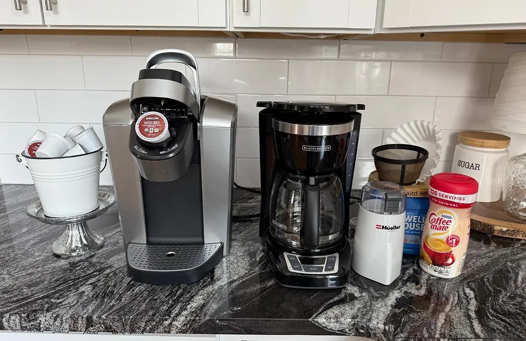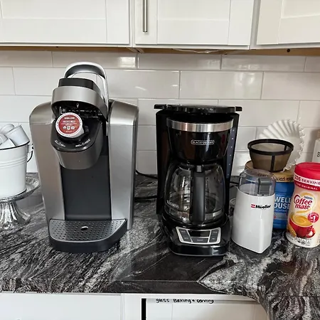 Há cozinha equipada com microondas e refrigerador, bem como comodidades para refeições no quarto, tais como máquinas de café/chá.